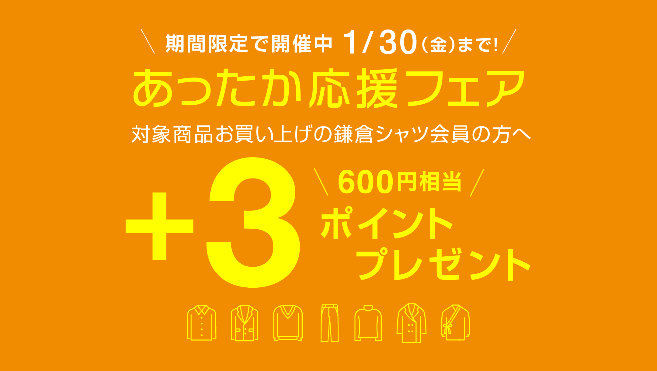 メーカーズシャツ鎌倉では、1月16日(金)から1月30日(金)まで、対象商品をお買い上げいただいた会員様全員にプラス3ポイント(600円分)をプレゼントする、「あったか応援フェア」を開催いたします。
