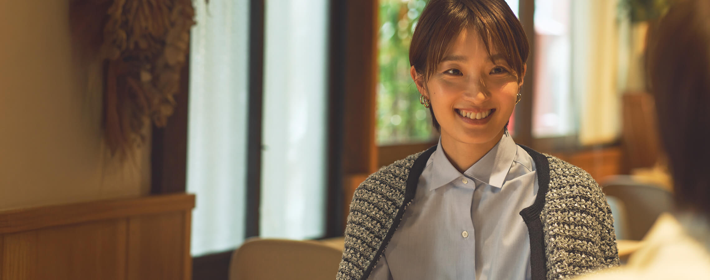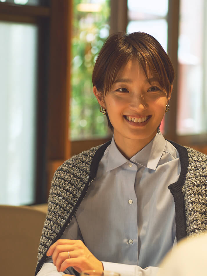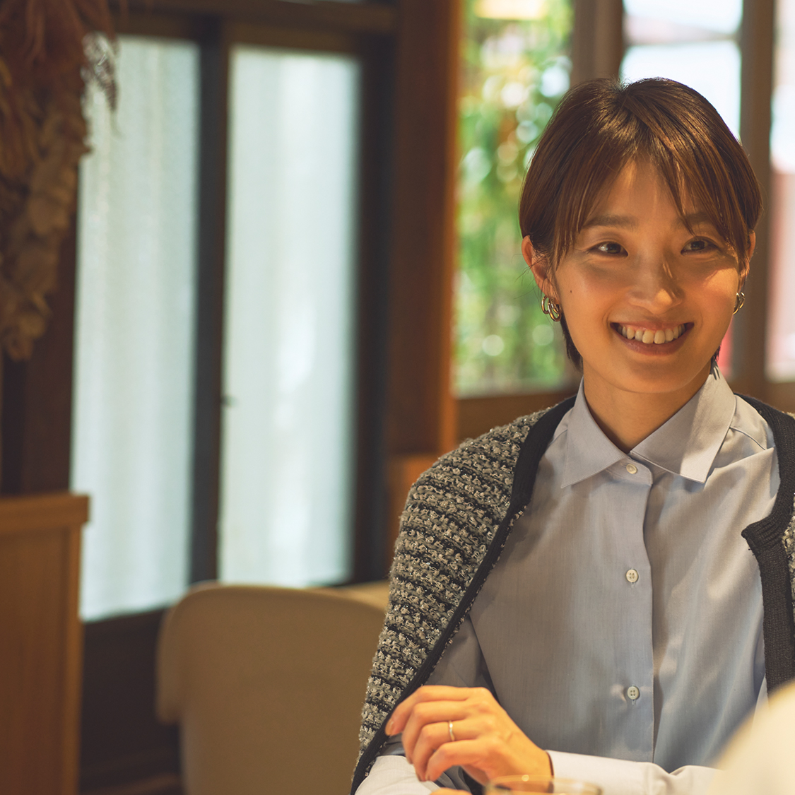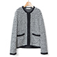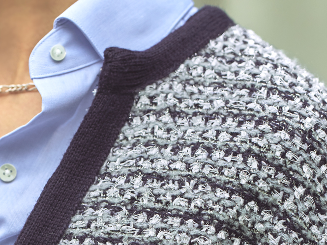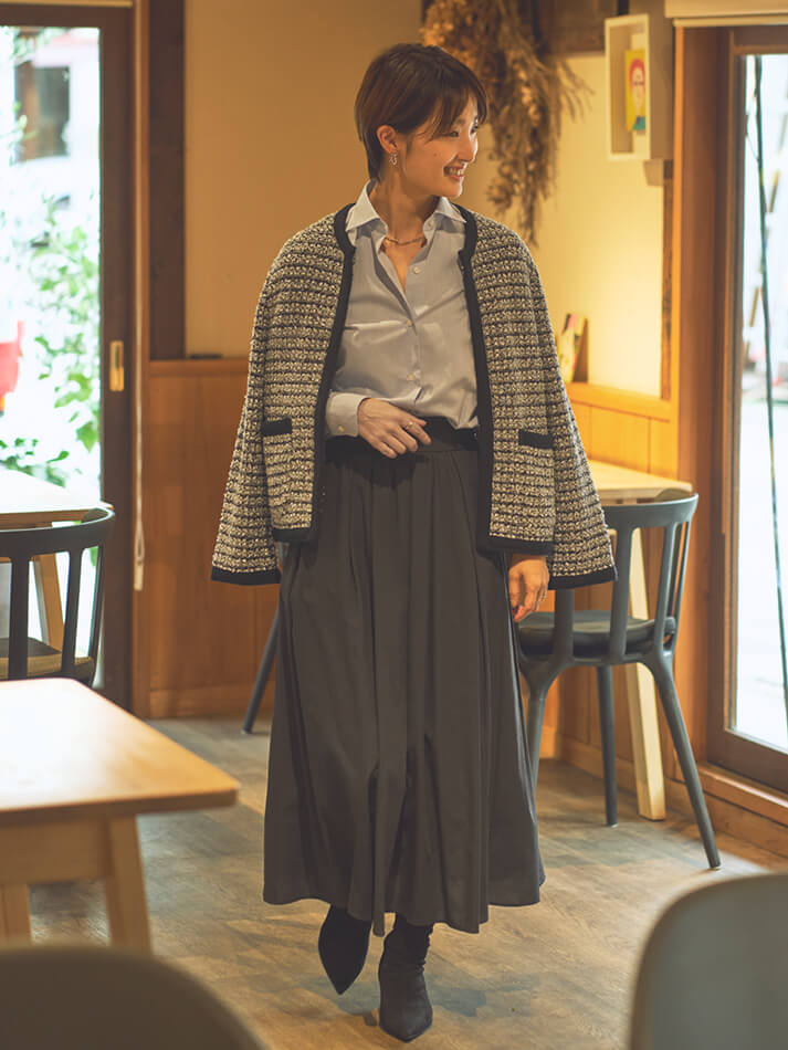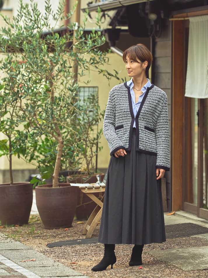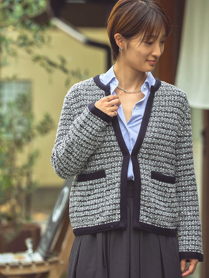 ニットジャケット爽やかなブルーのシャツにツイード調のニットジャケットを合わせて、上品なお出かけスタイルに。