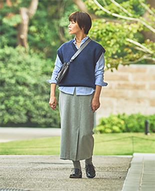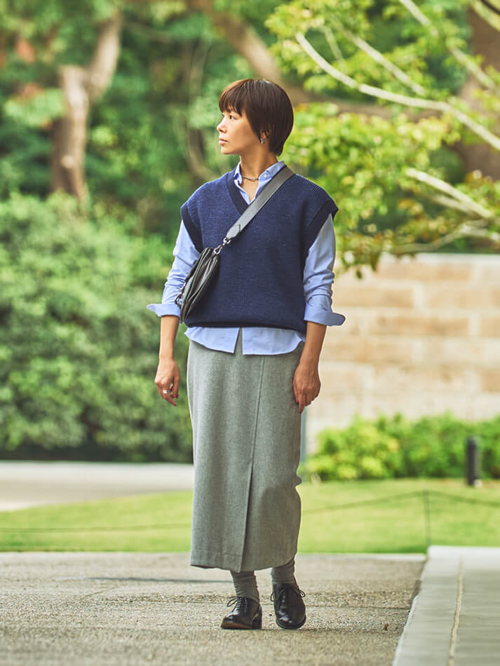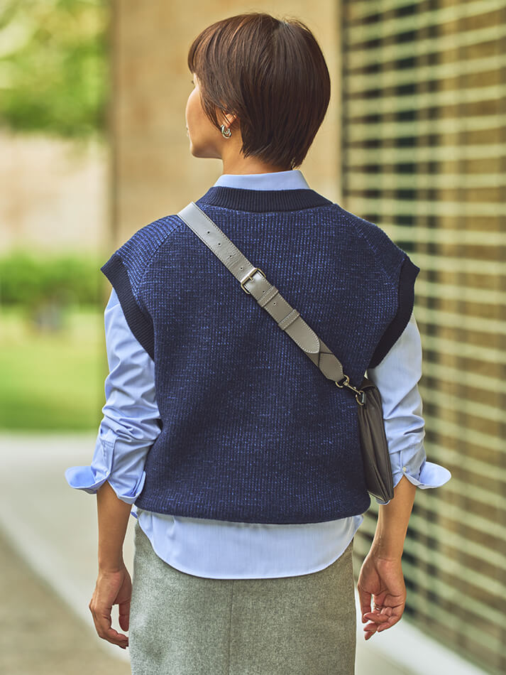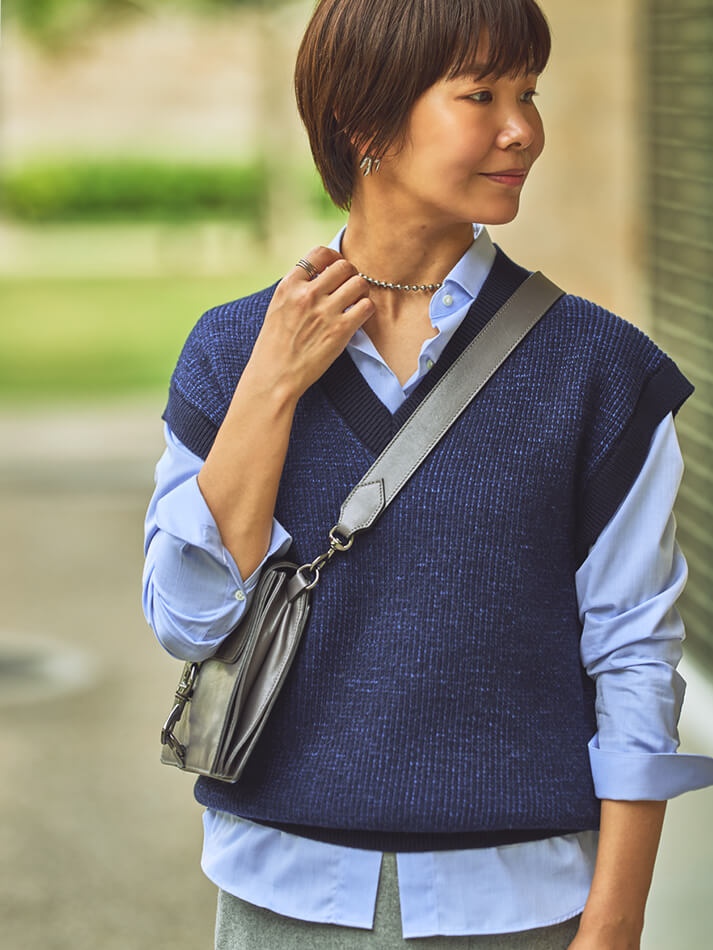 Vネックベストブルートーンのアイテムを重ね、爽やかな印象に。小物をきれいめで揃えれば、カジュアルスタイルも品よく仕上がります。