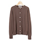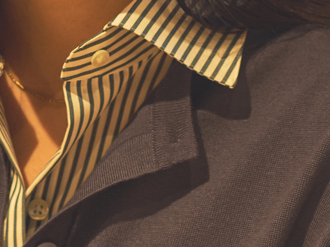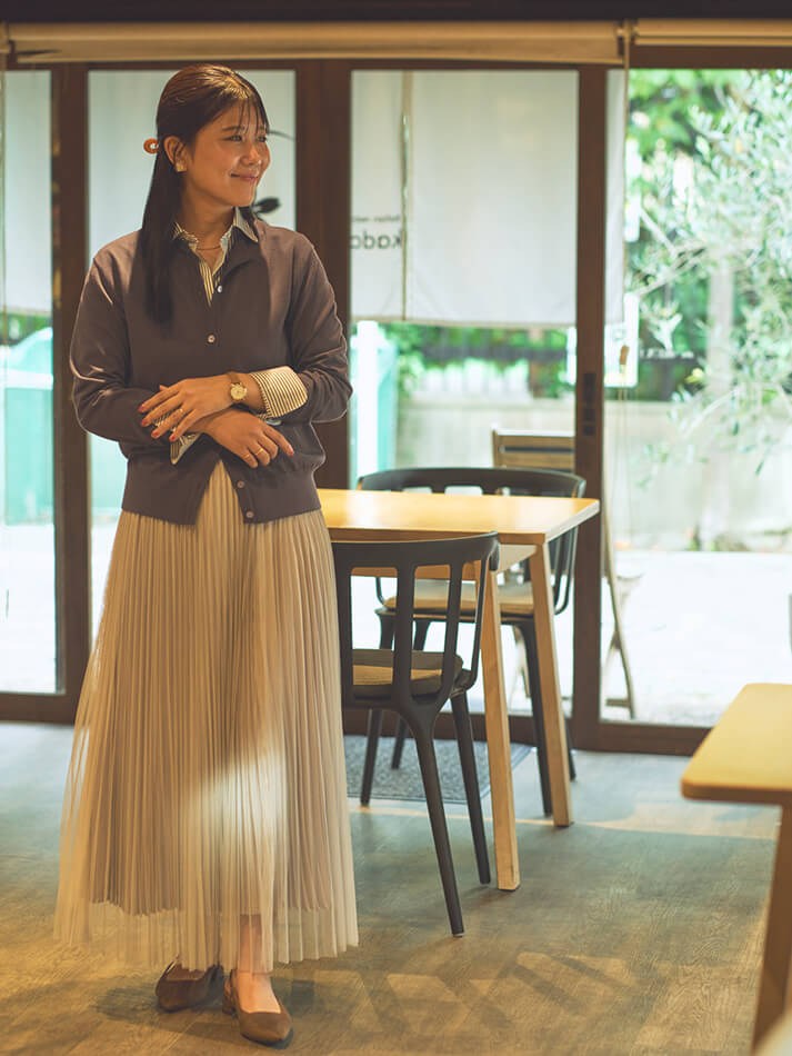 ニットカーディガンきちんと感のある上品な着こなし。フィット感のあるシャツとカーディガンは、襟を開けてカフスを見せて、抜け感をプラス。