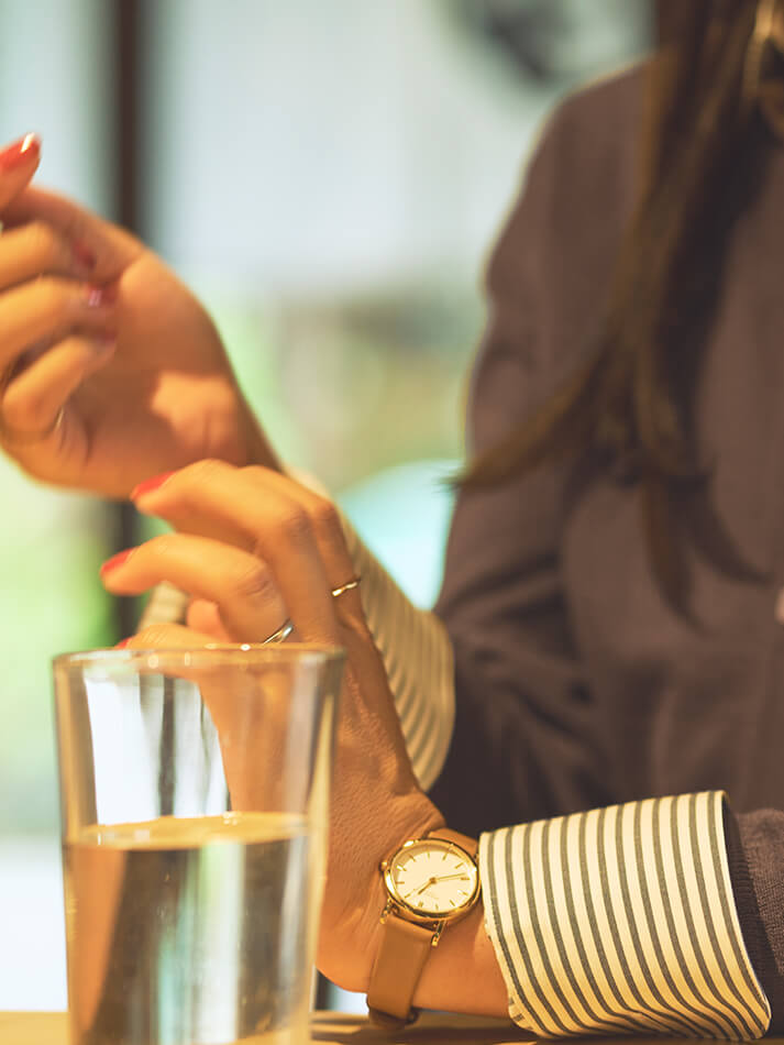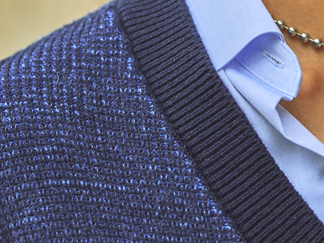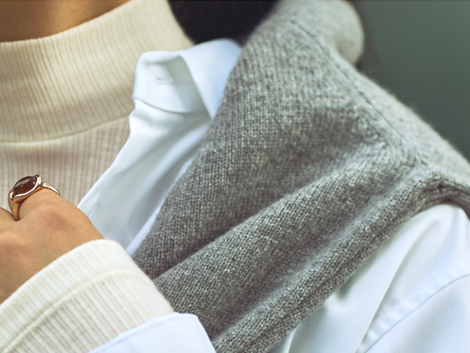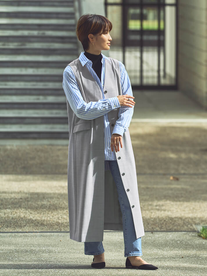 ハイネックプルオーバーカシミヤ×シルク素材のハイネックプルオーバーに、シャツとジレを重ねます。ジーンズでカジュアルダウンしてリラックス感のあるスタイルに。