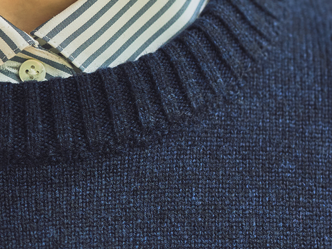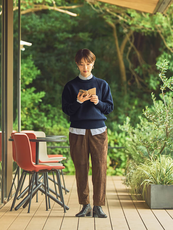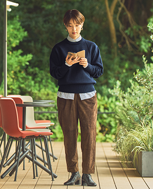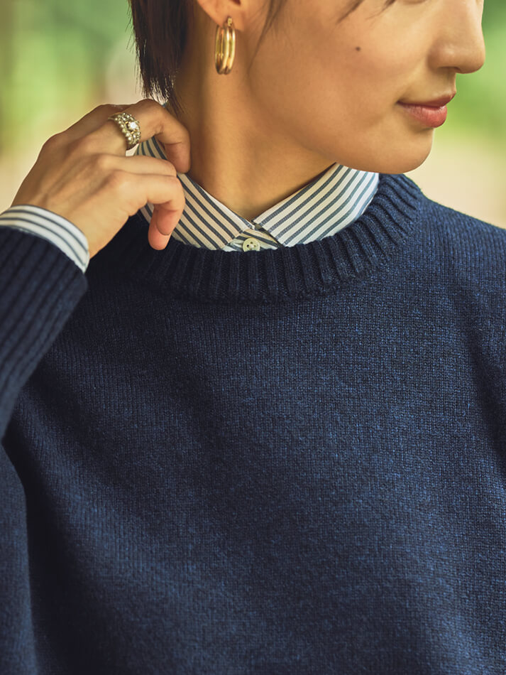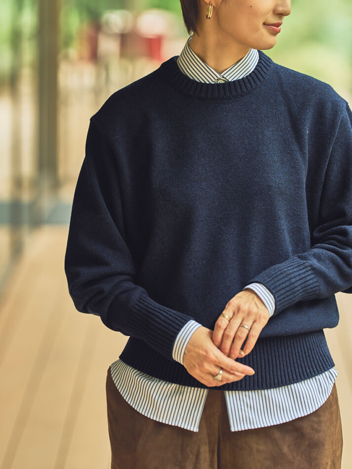 クルーネックプルオーバーナチュラルな大人のデイリースタイル。ゆったりニットから覗くシャツが、印象をほどよく引き締めます。
