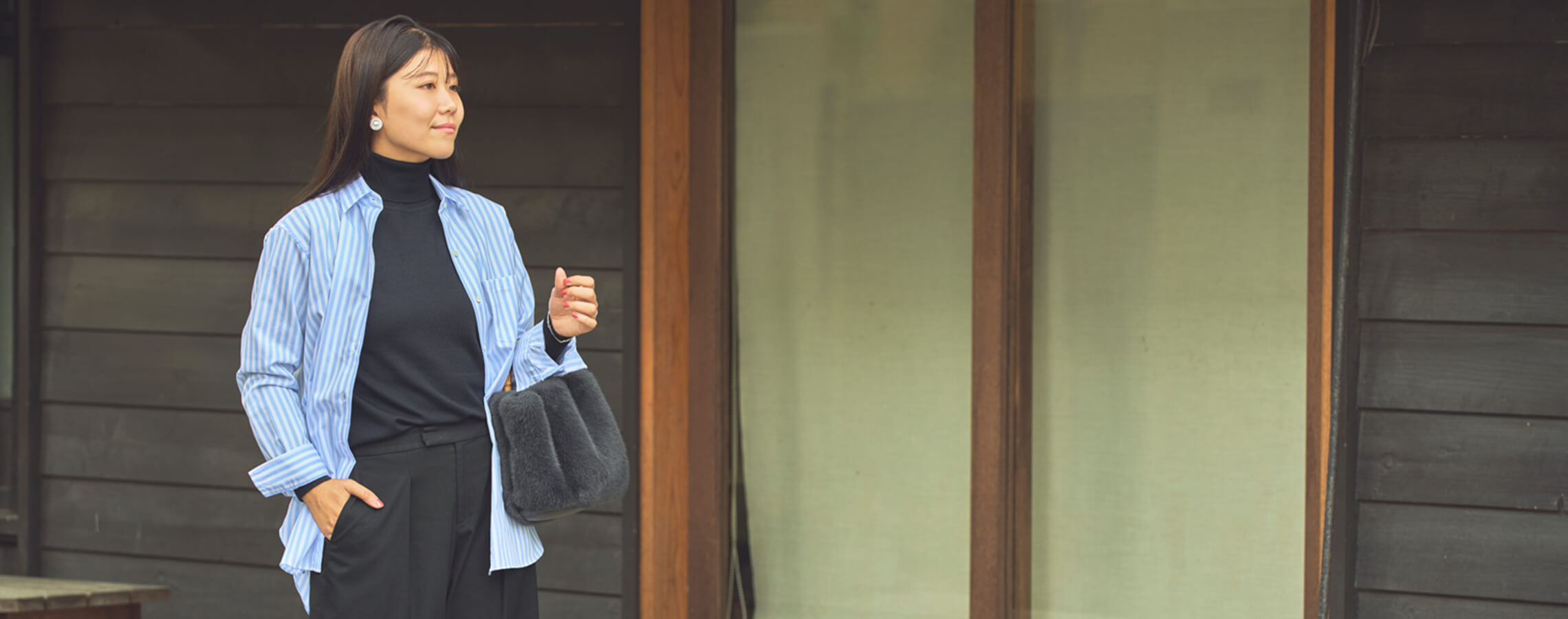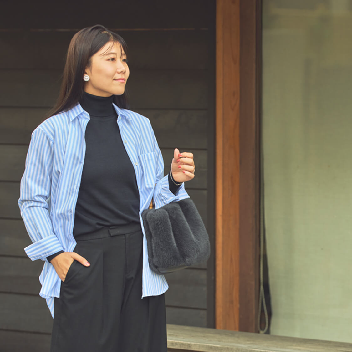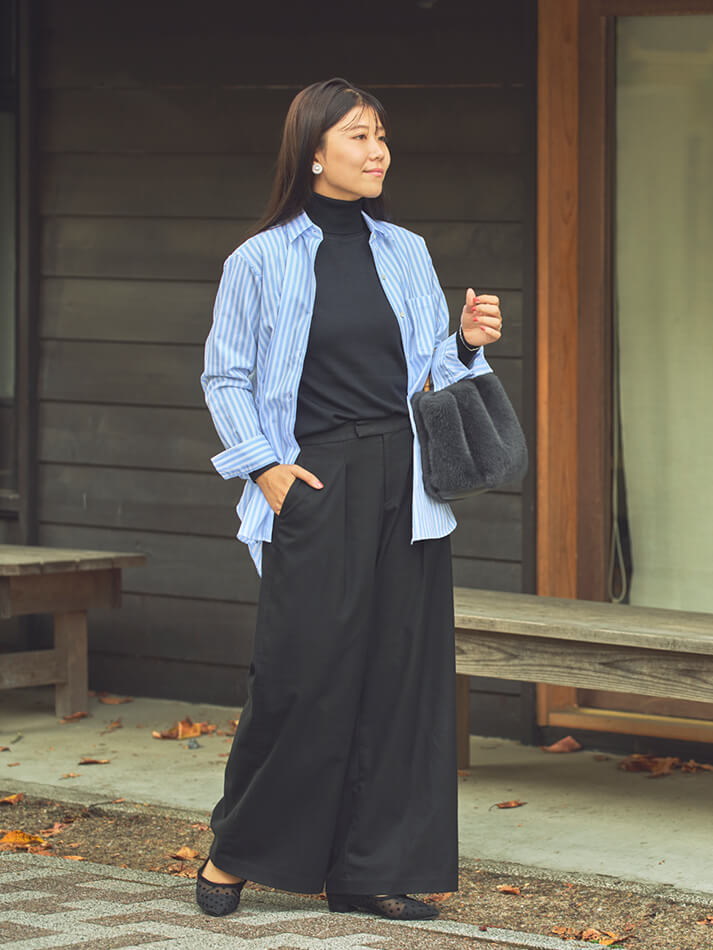タートルネックセーターブラックのワンツーコーデに、ストライプシャツを羽織り軽やかさをプラス。シンプルに洗練された大人のスタイル。