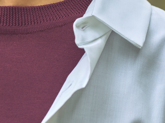 クルーネックセーター深みのあるバーガンディカラーが秋らしい、ハイゲージのセーターをシャツのインナーに。スカーフをアクセントにした上品な着こなし。