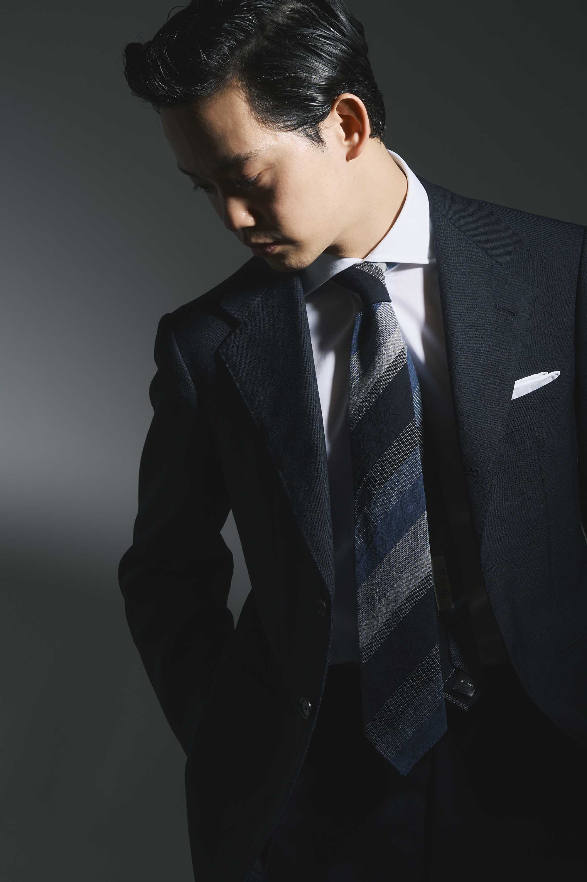 今回の仕立ては、裏地をあえて排した「スフォデラート仕様」。伝統の趣(おもむき)を重んじつつも、軽やかで現代的なVゾーンを演出します。