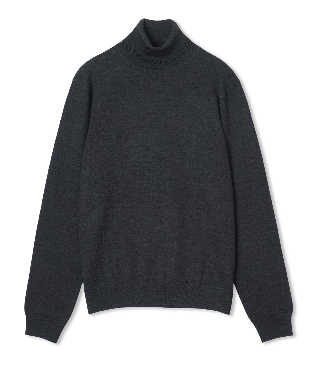 スーパーエクストラファインメリノ(12ゲージ)で編み上げた、タートルネックニット。