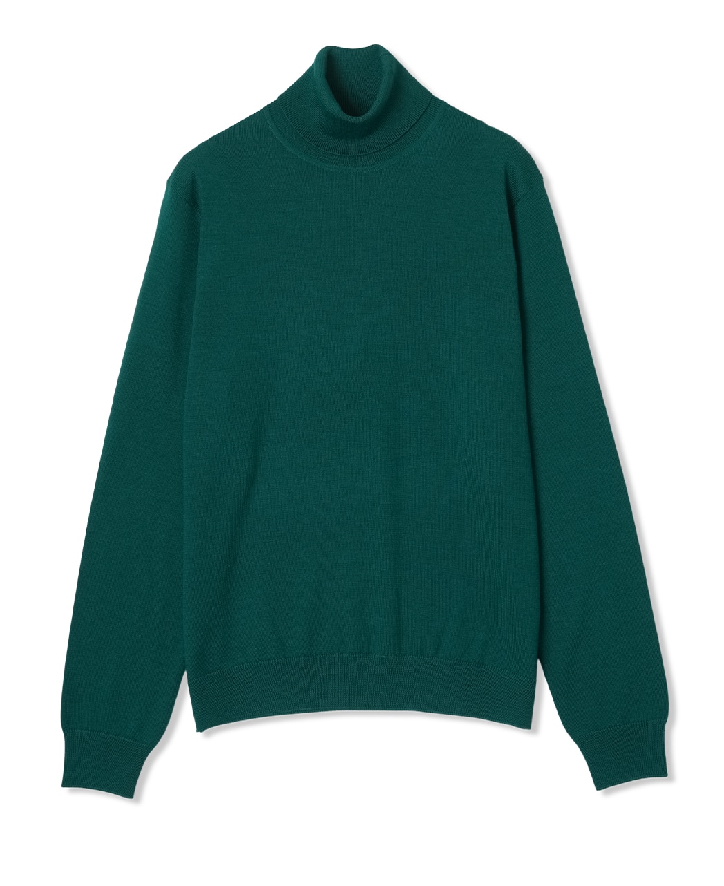 スーパーエクストラファインメリノ(12ゲージ)で編み上げた、タートルネックニット。