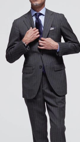 43-87を余裕をもって着用。袖は若干短いので、普段はオーダーで89cmに伸ばしています。