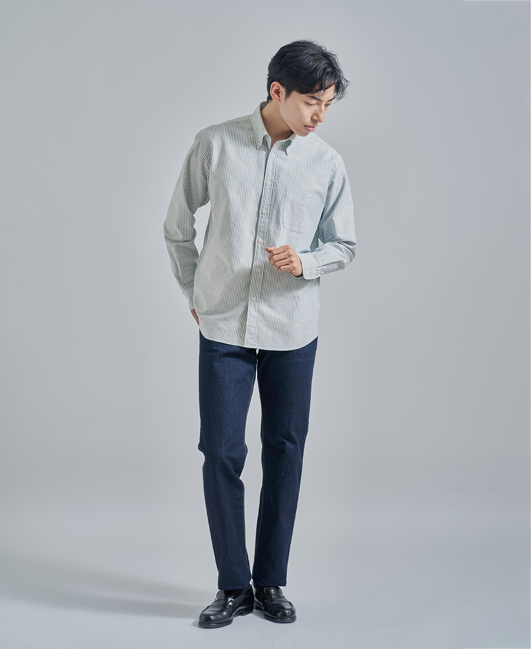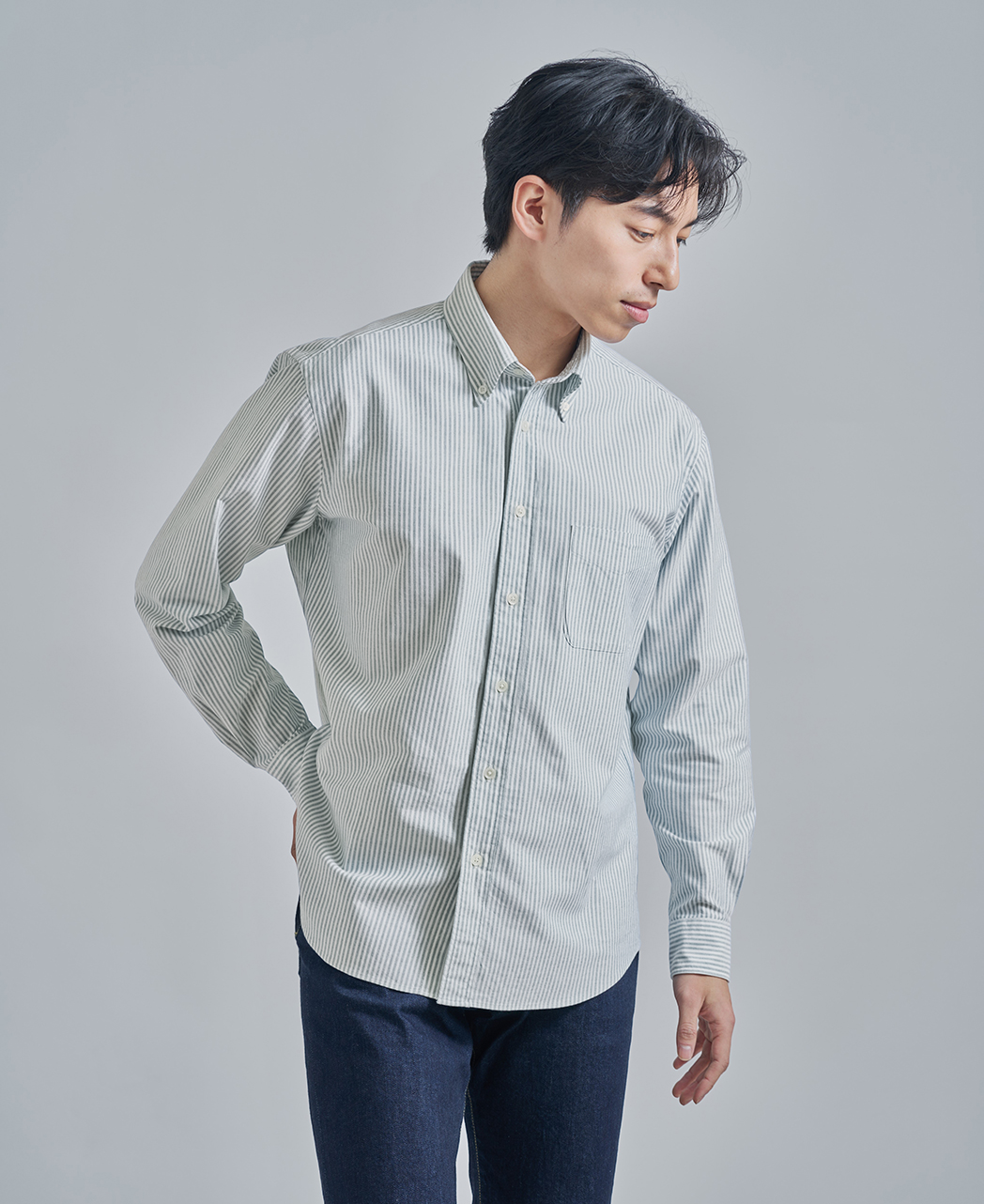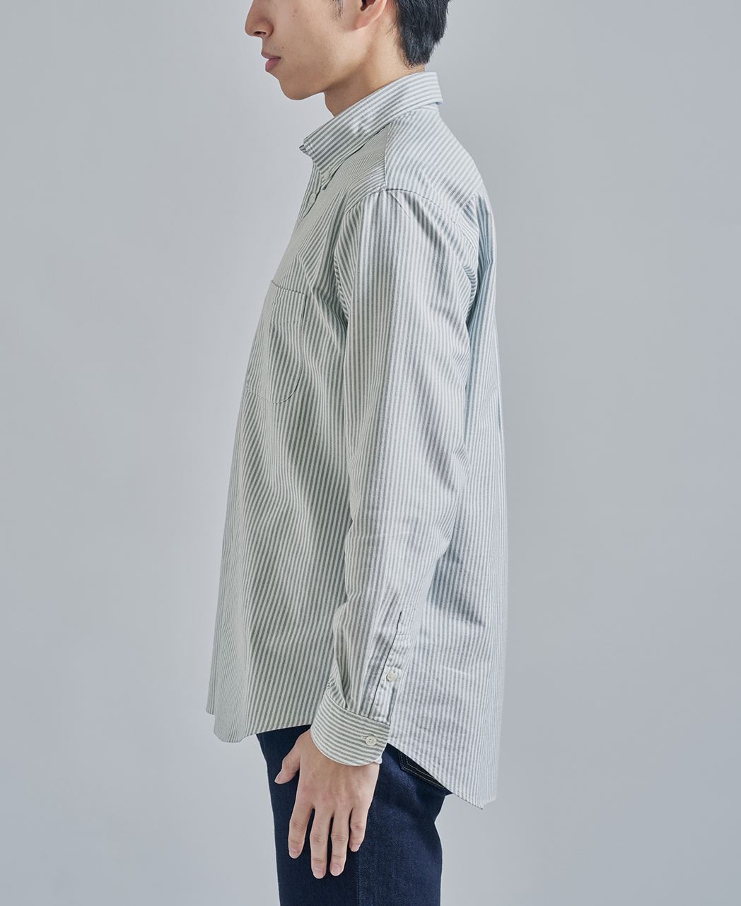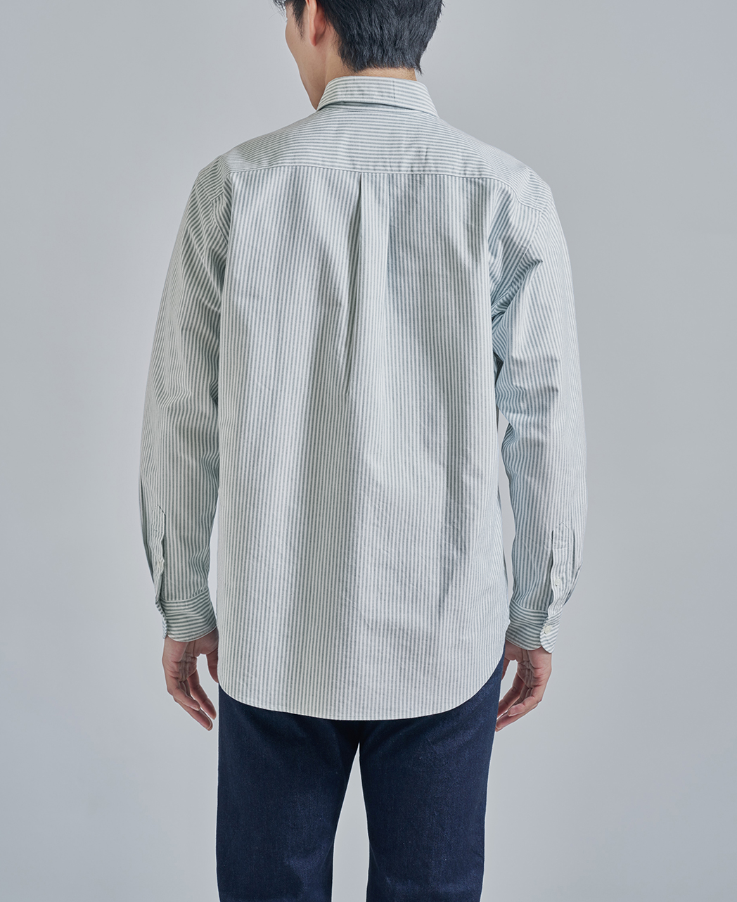 ドレスアップにもカジュアルにも使える、メンズウェアの大定番シャツと言えばオックスフォードボタンダウンシャツ。 70~80年代の黄金期にアメリカブランドを支えた、兵庫県西脇産地のオックスフォード生地を別注生産しました。 今回のモデルチェンジで実現したのは、首元で主張しすぎないコンパクトな襟、肩や二の腕のゆとり、そして、裾を出した時に裾が自然なカーブを描くこと。 Tシャツの上に羽織ってアウター使いしたり、ニットタイを巻いてブレザーを着たり、思い思いの着こなしで楽しんでいただければ嬉しいです。