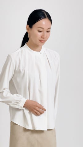 襟と袖口にあしらわれたパールボタンがエレガントで、コーディネートに華を添えます。