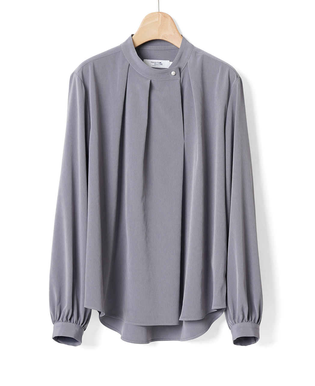 襟と袖口にあしらわれたパールボタンがエレガントで、コーディネートに華を添えます。