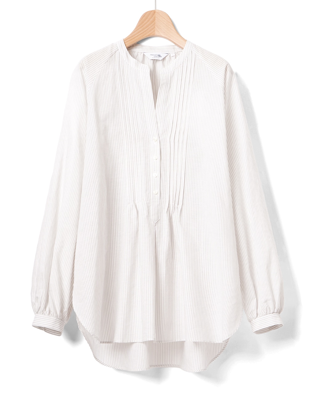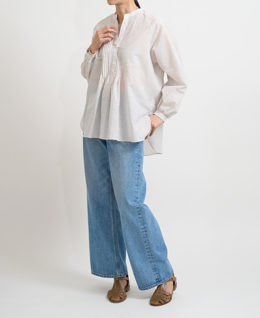 ・胸もとにピンタック、袖やバックスタイルにギャザーをあしらっています。