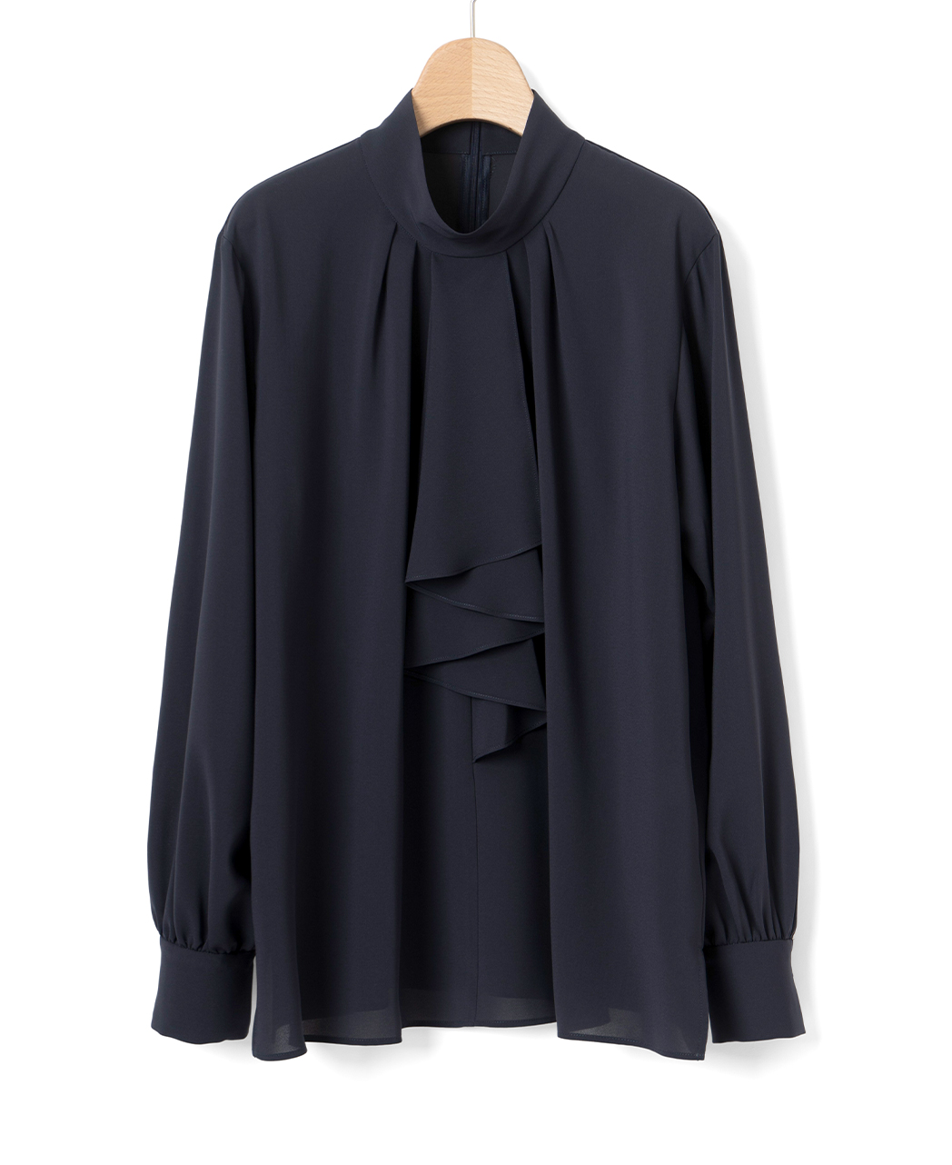 襟もとに施されたタックデザイン、袖口のギャザーなど、