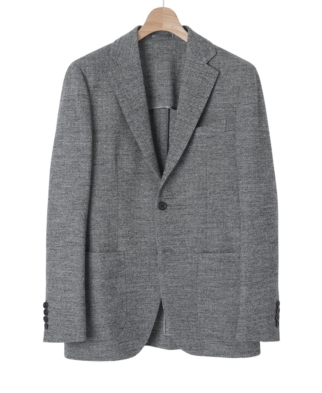 繊細なヘリンボーン織が上品な印象を与え、ビジネスにもカジュアルにも対応する万能な一着です。