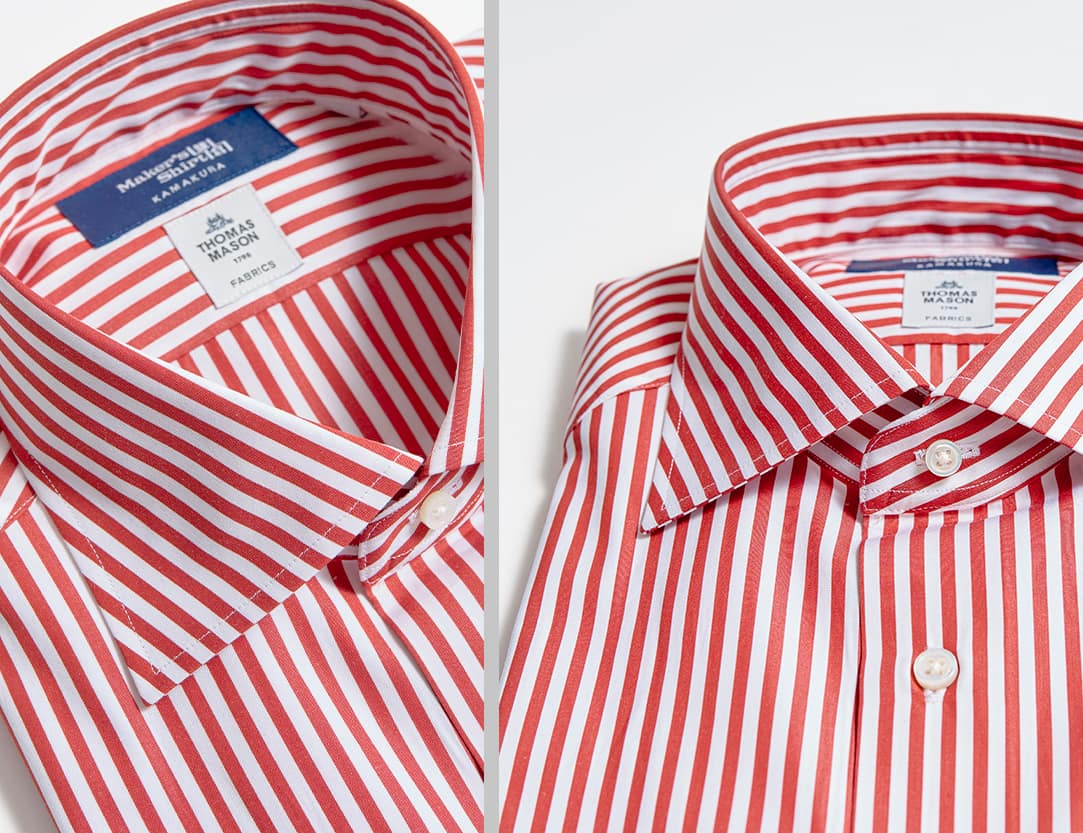 宮澤 フランチェーゼよりもミリ単位で角度をやや狭くして、この THOMAS MASON が持つ英国的な香りに合うように襟を設計したんです。ぜひ店頭で見比べてみてください!