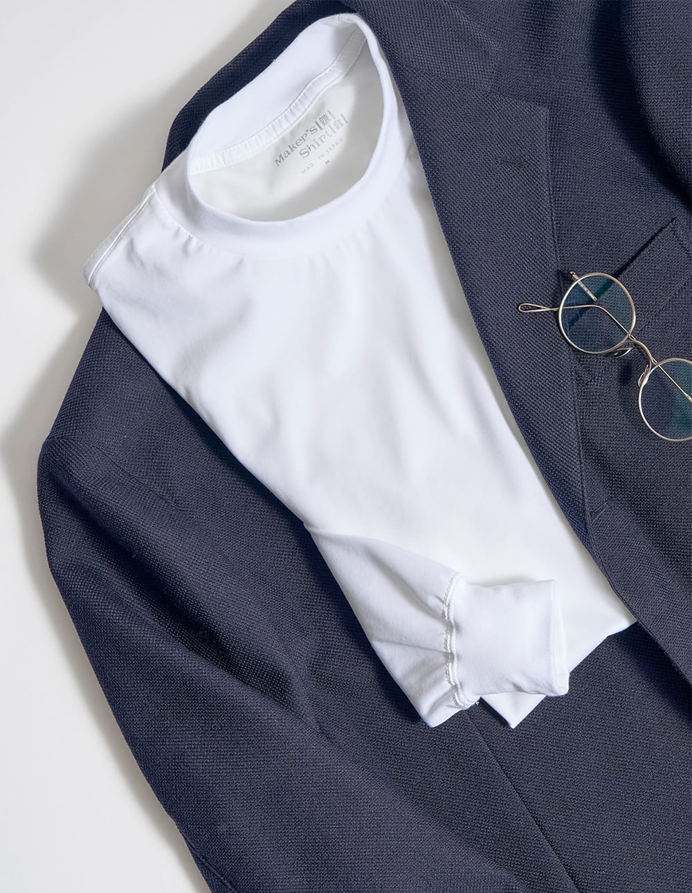 コバ このTシャツは実は僕が企画の発端なんです(自慢)。プレミアムサーキュラーのストレッチシャツをかなり愛用していて、生地感も良いし、透けないのも◎。ジャケットのインナー着用を想定して襟も高めに設定しているし、とにかくビジネスでTシャツ着用が許されている皆様には、ぜひ手に取っていただきたいです!
