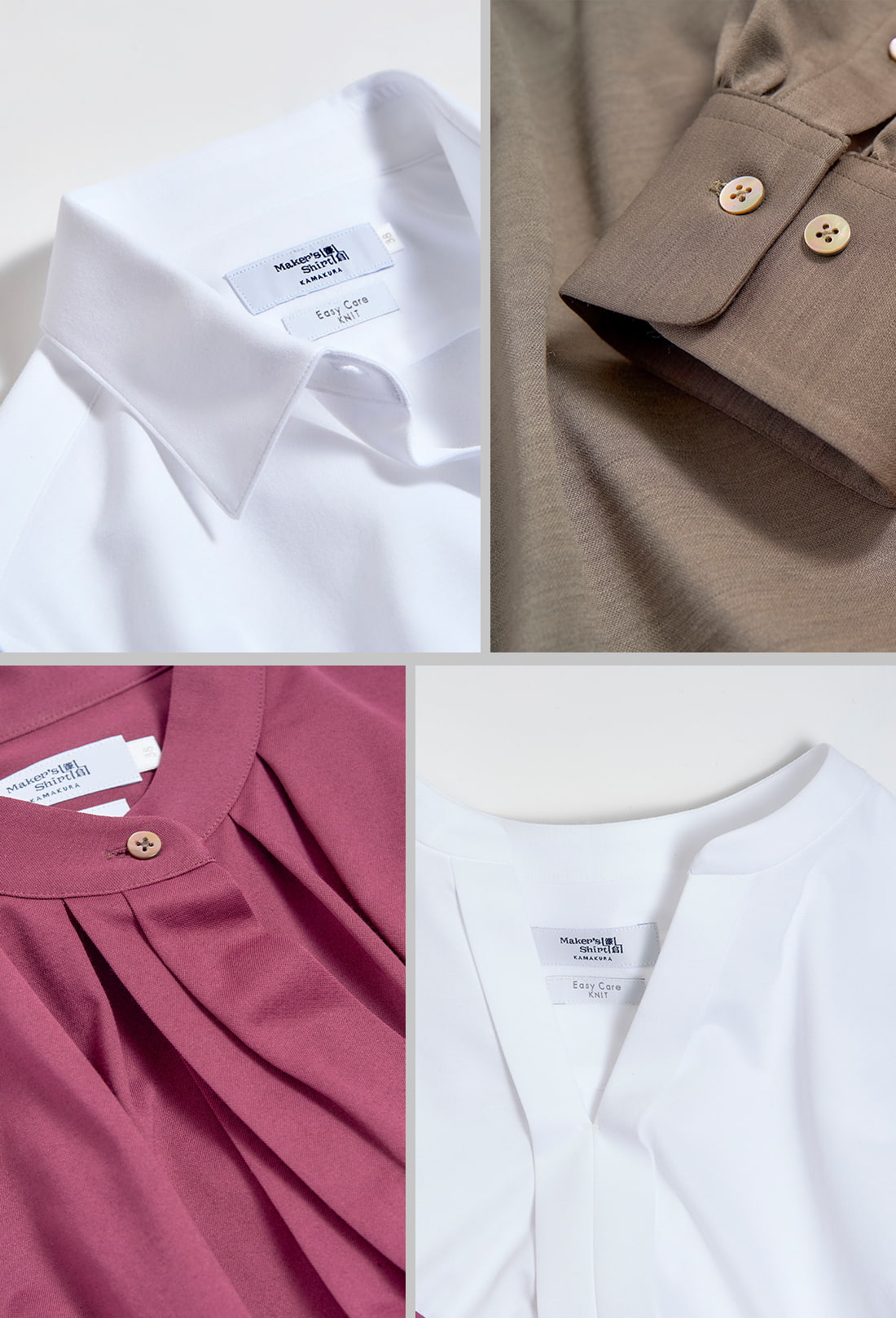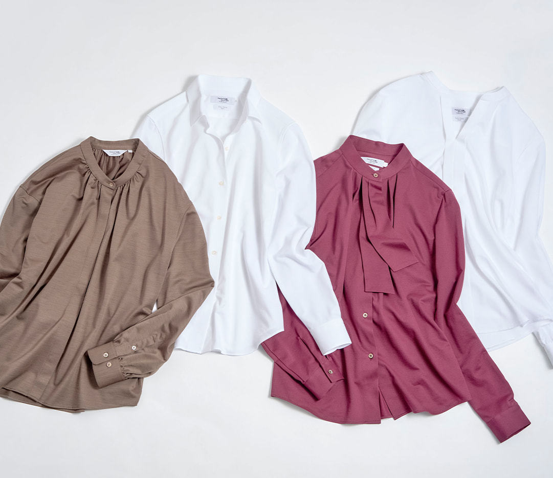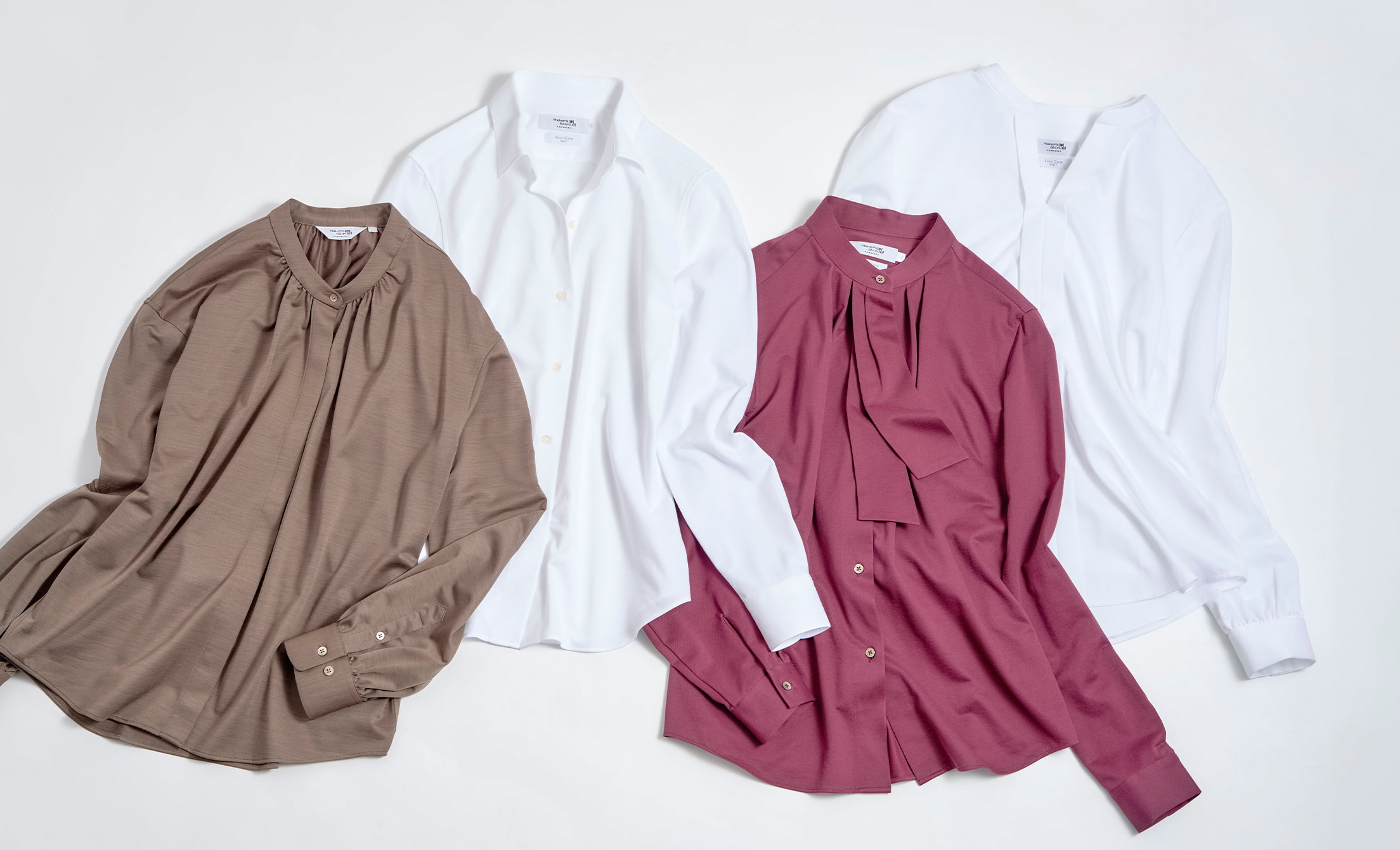 シャツの一般的なイメージをくつがえす。それがJ-TECH STRETCHの素材で仕立てたシャツ・ブラウスです。一般的なシャツに対するイメージは「きちんと感」や「清潔感」でしょうか。でも裏を返すと、「堅苦しい」といったイメージも少なからずあるのでは・・・。そんなマイナスのイメージを覆してくれるのがストレッチシャツです。日常で役立つ様々な機能をもつ素材なのですが、最大の魅力は抜群の伸縮性をもち、とても快適な着心地のよさ。プラスして、ドレスシャツのような美しさも兼ね備えています。年末年始のドレスアップスタイルにも合わせられるように、キーネックやボウタイブラウスなど、華やかな印象のデザインを豊富にご用意しています。
