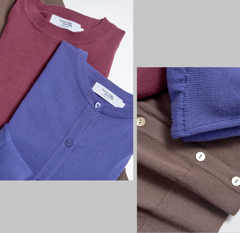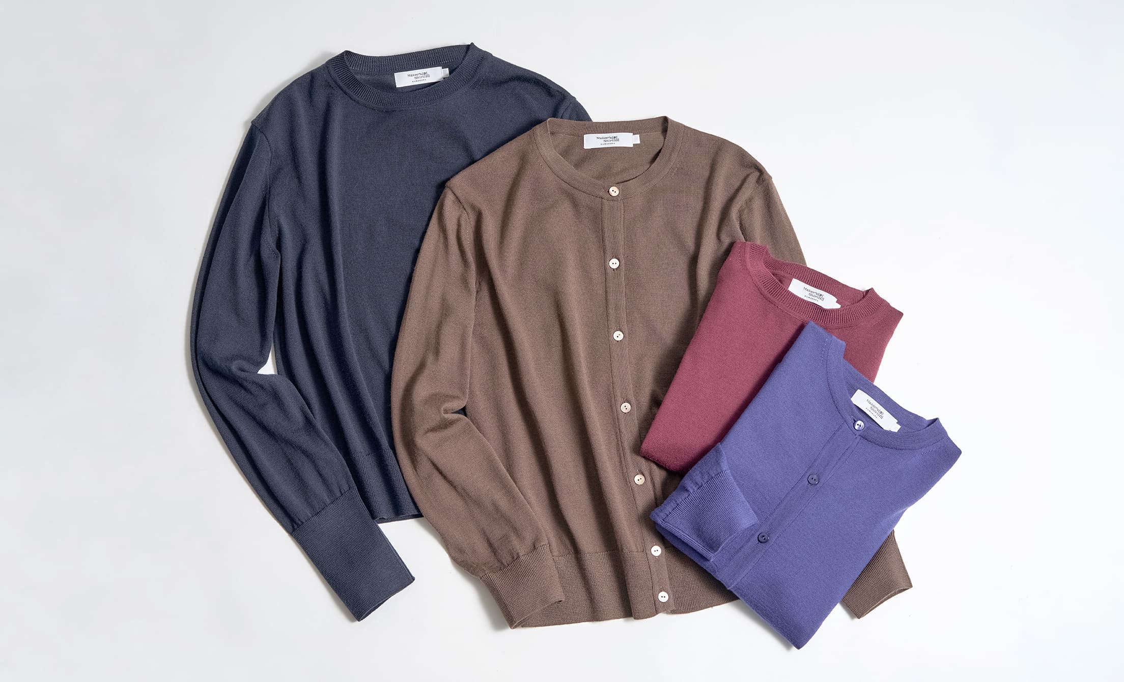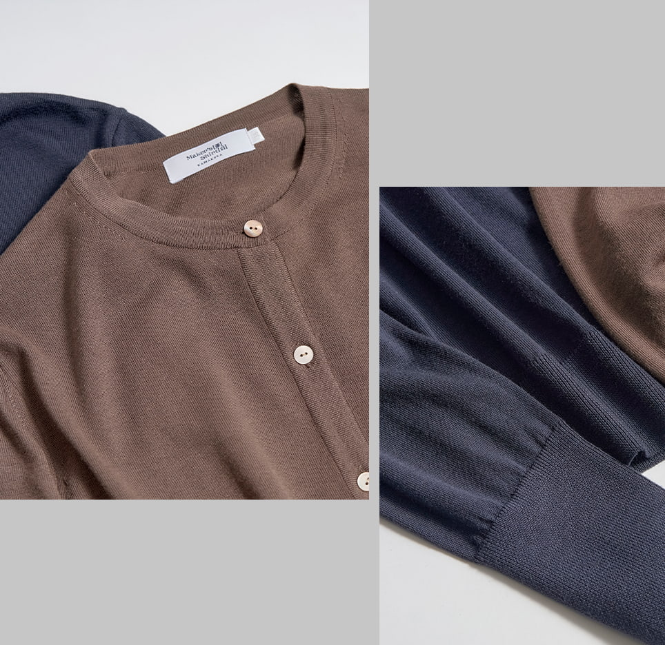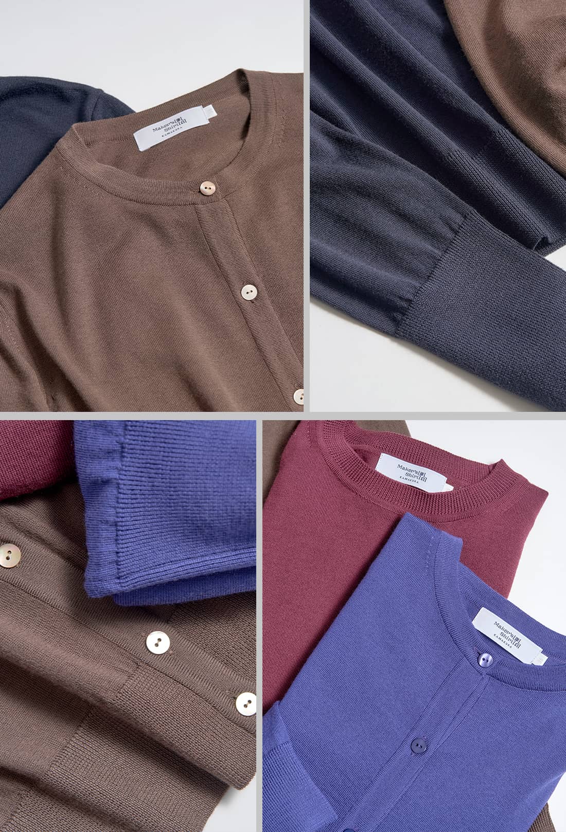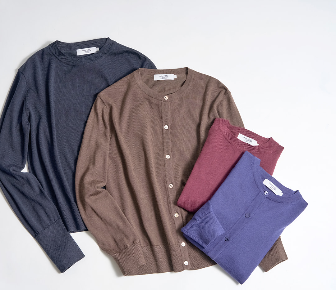 鎌倉シャツの秋冬の定番的アイテムとして欠かせない「ハイゲージニット」。一貫して日本製の品質にこだわり、国内でもトップクラスの技術を誇る工場で生産しています。一見、シンプルなセーターとカーディガンですが、袖を通してみればきっと、その着心地の良さに驚くはず。上質な素材ほど余計な装飾はいらないと考え、ミニマルなデザインに仕上げました。上質なウールそのもののよさを肌で感じられる贅沢さと、コーディネートするアイテムを選ばない汎用性が魅力です。昨年までは14ゲージで作製していましたが、今季は久々に、よりきめ細やかな18ゲージ素材を採用。軽やかに重ねられる薄さで、春先までお楽しみいただける一枚です。