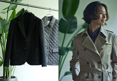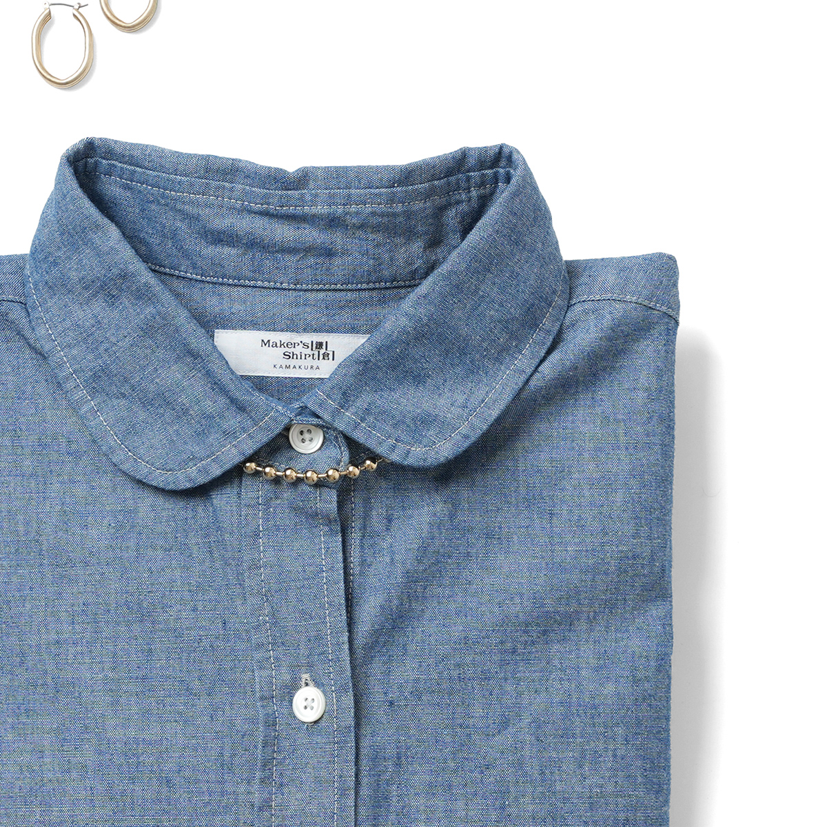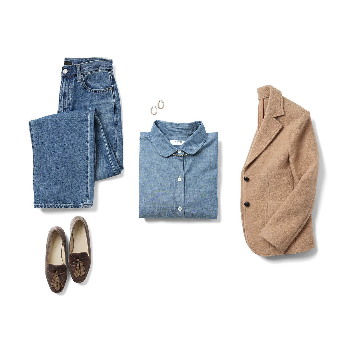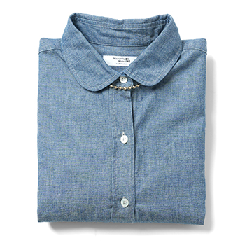 トラッドな雰囲気漂う、大人のジャケットスタイル。シャンブレーデニムのラフな素材感をラウンドカラーでやさしい印象に。ほどよい抜け感と上品さが魅力です。