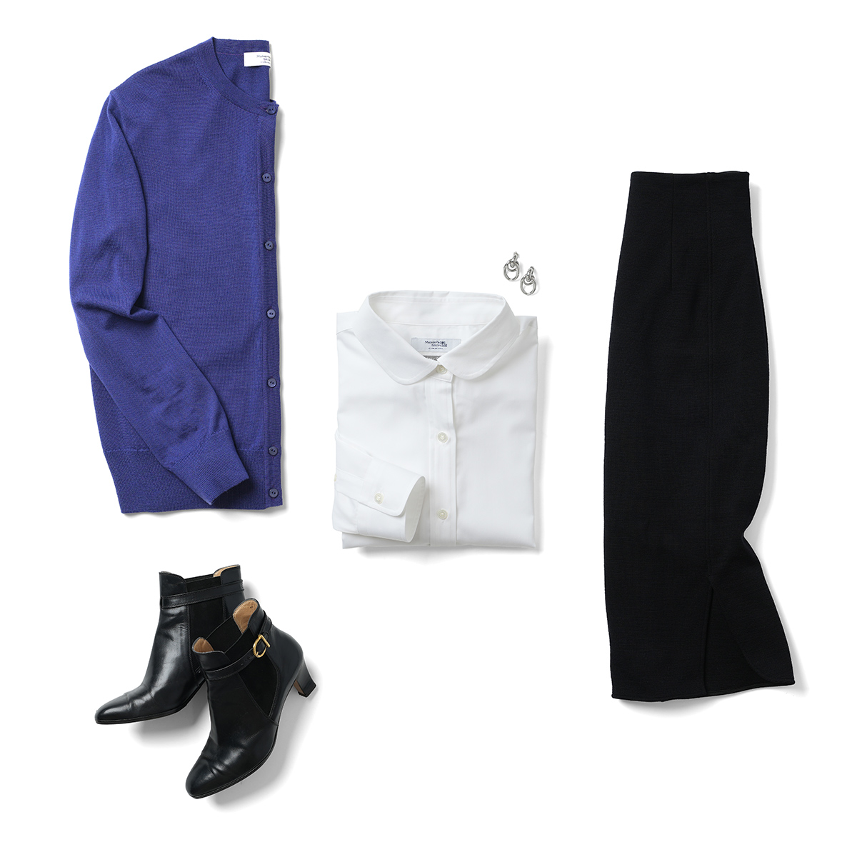ラウンドカラーシャツを都会的なオフィススタイルで。ニットのパープルとスカートのブラック、モードな配色が甘い印象のラウンドカラーを引き締める。