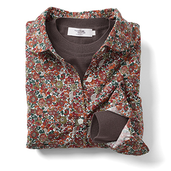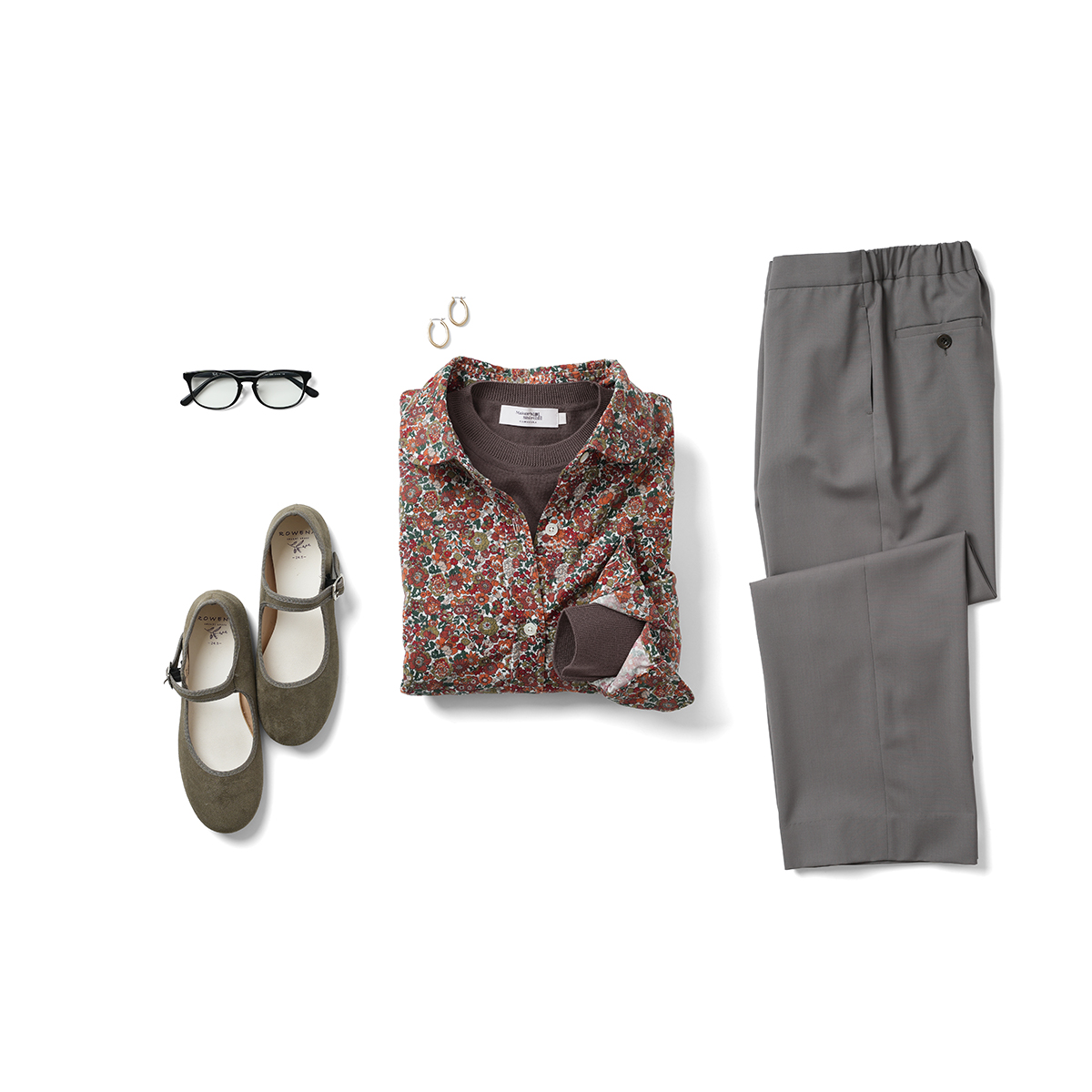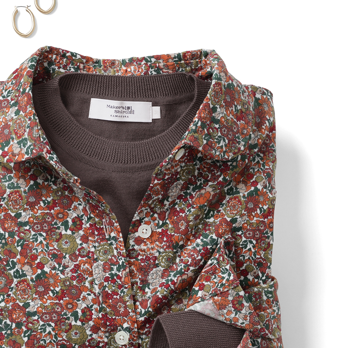 シャツの赤を引き立てる、ブラウンカラーで統一したスタイリング。カジュアルな印象のコーデュロイシャツには、あえてきれいめなアイテムを合わせることで大人の着こなしに。