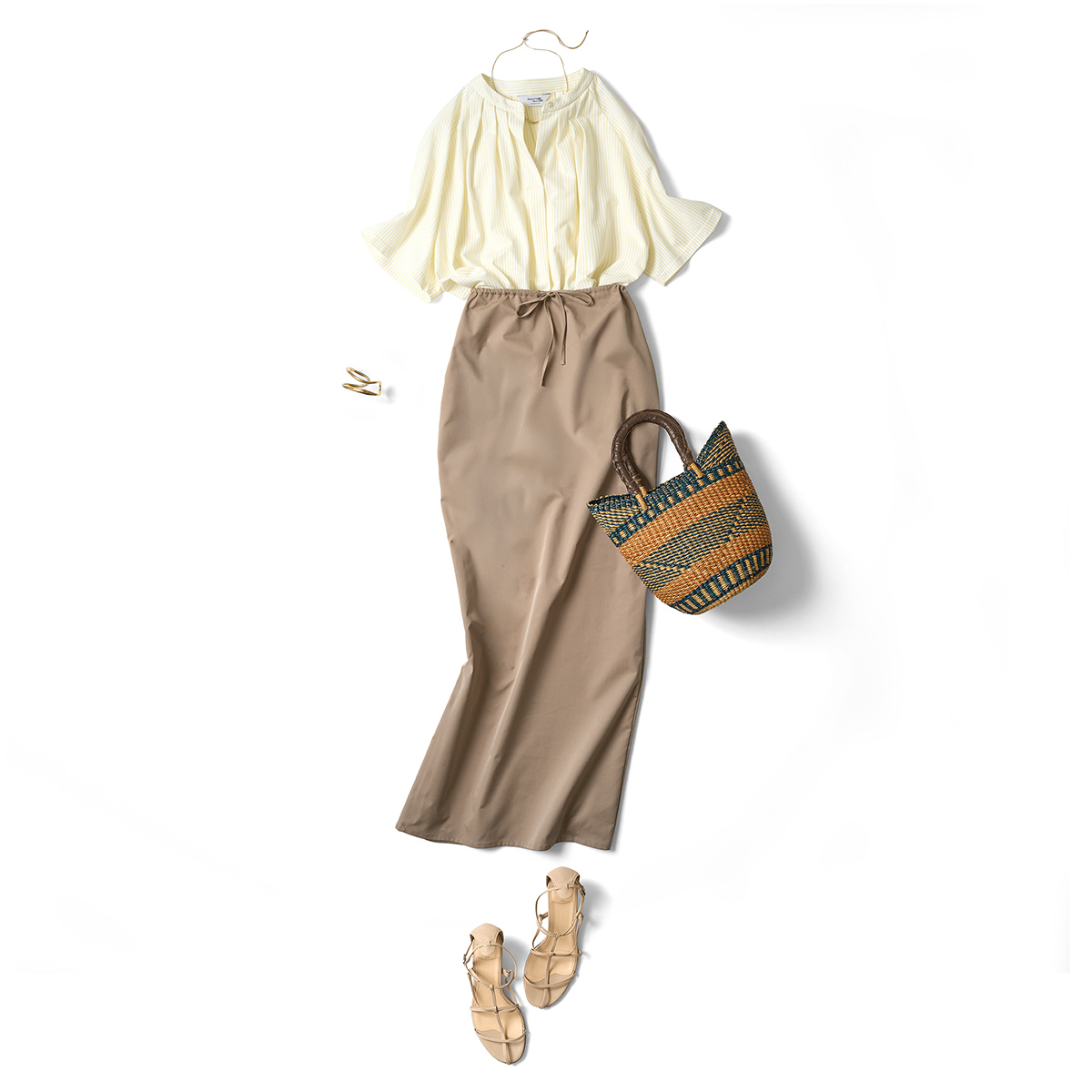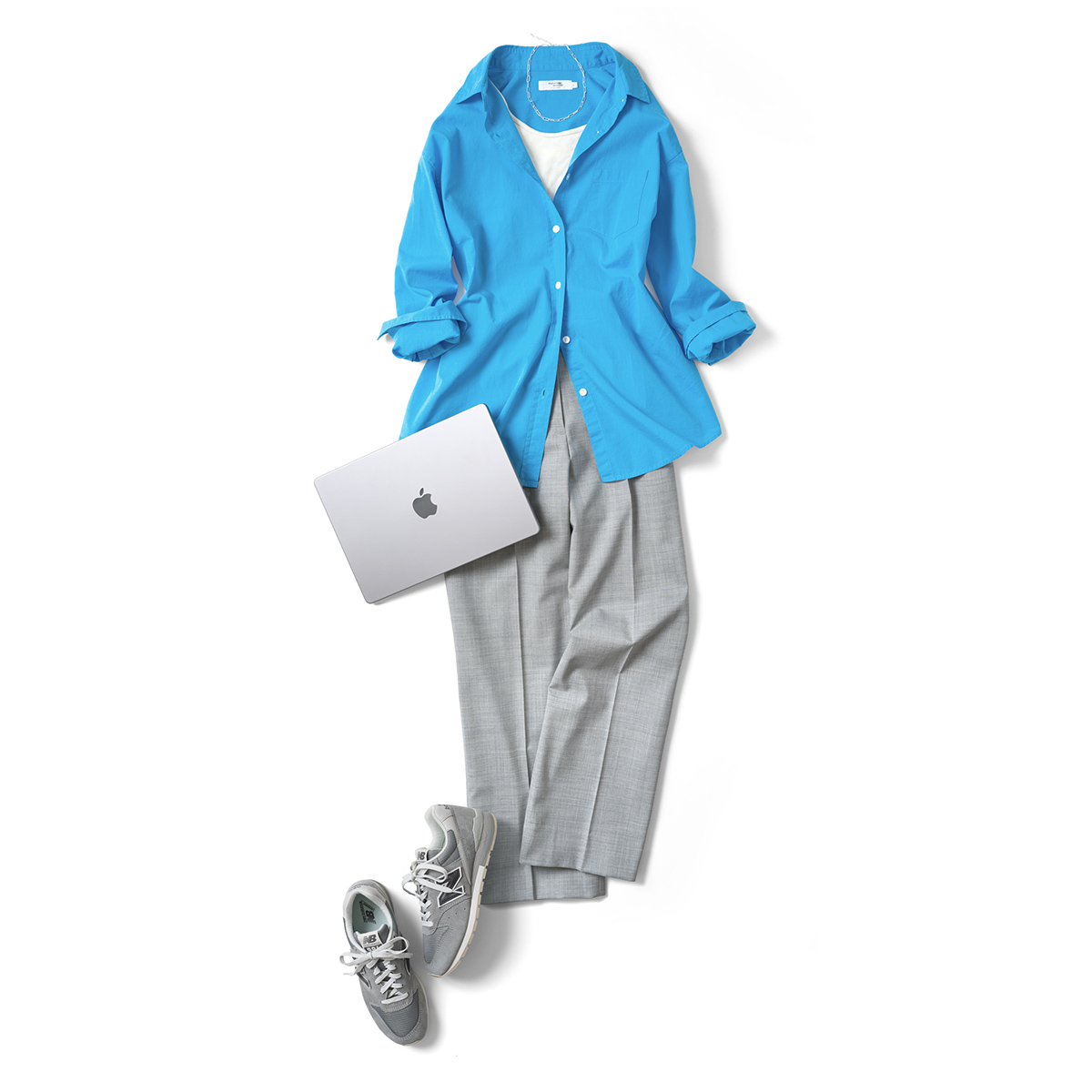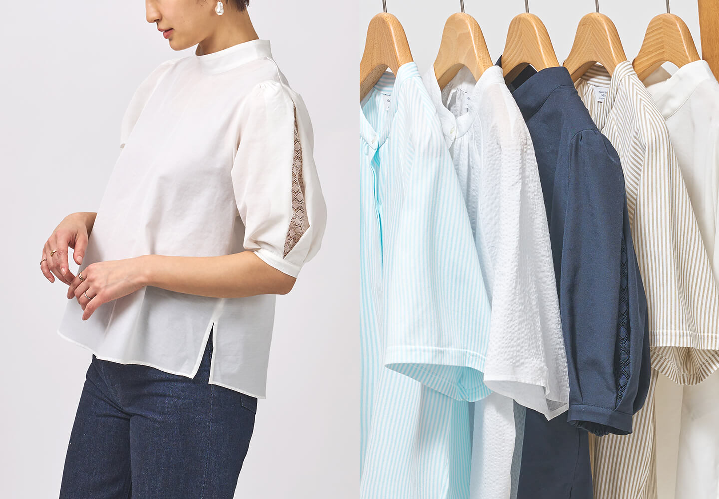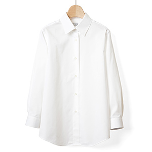様々なアイテムとのコーディネートが可能な白シャツ。ブレスレット丈の袖なら、腕時計やブレスレットにかからず、すっきりとした印象の手もとに。季節感も演出します。