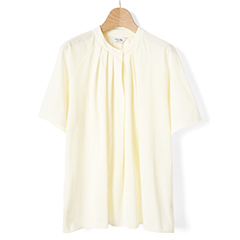 ストレッチ性に優れた素材で、Tシャツのように楽な着心地のブラウス。デコルテを美しく見せるネックデザインが、顔まわりを華やかに印象づけてくれる。