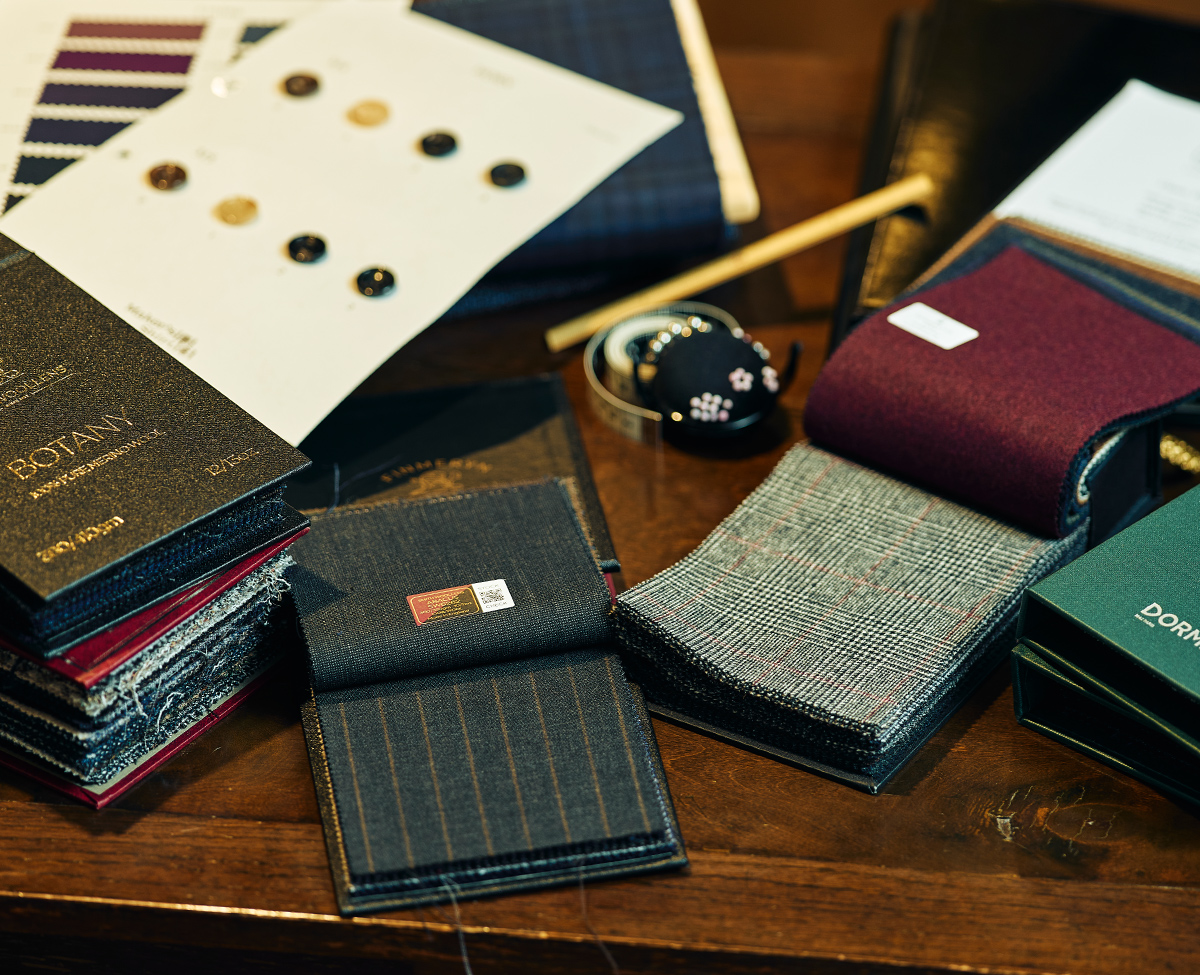 国内有数のウール産地、尾州にて生産される高機能服地をはじめ、イタリアの“Zegna”や“Loro Piana”、英国の“Harrisons”、フランスの“Dormeuil”等、世界的に信頼のある老舗ブランドの服地を広く取り揃え、常時1,000種類以上からお選びいただけます。