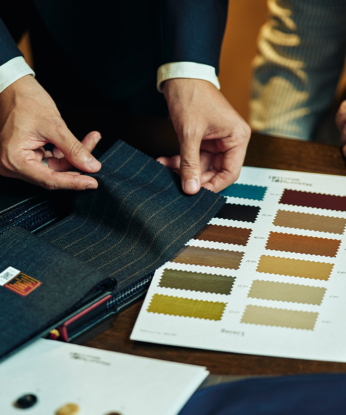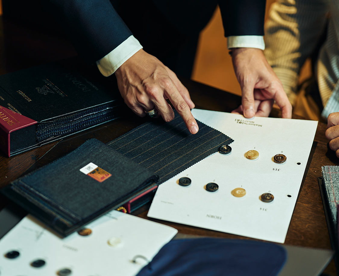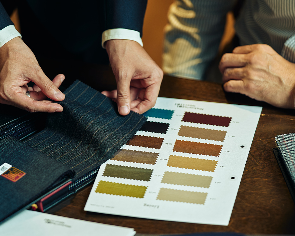 まずはお客様と相談しながらスーツのイメージを決めていきます。スーツ生地は幅広くご用意しておりますので、お好みや着用シチュエーションに合わせて、最適な服地をご提案いたします。