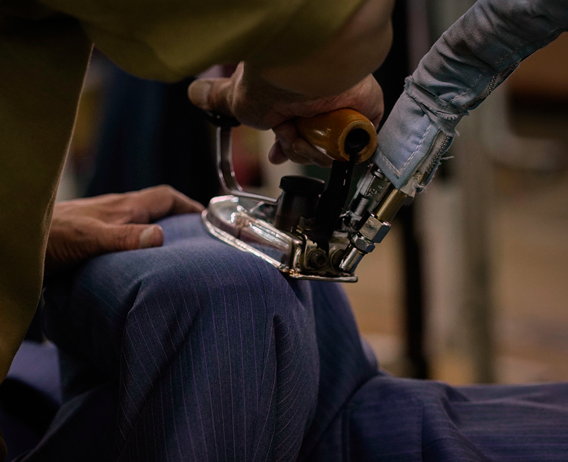採寸の数値をもとにサイズサンプルをお召しいただき、仕上がりのイメージを確認しながらフィッティングを行います。一つ一つの箇所を丁寧にフィッティングしながら体型補正を加えていくことで、お客様の体型にあった着心地のスーツが完成します。