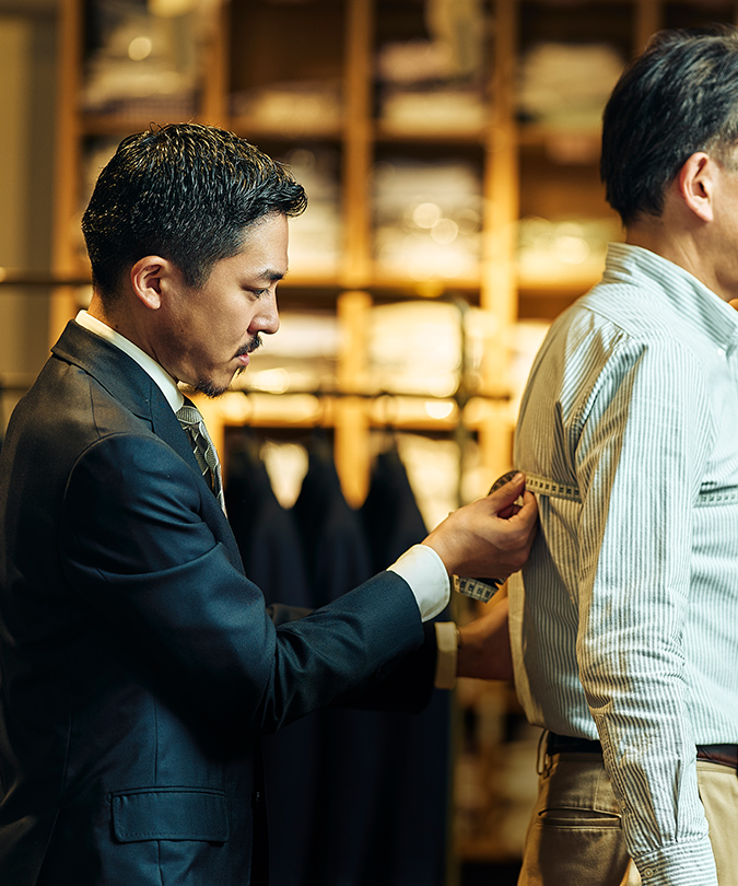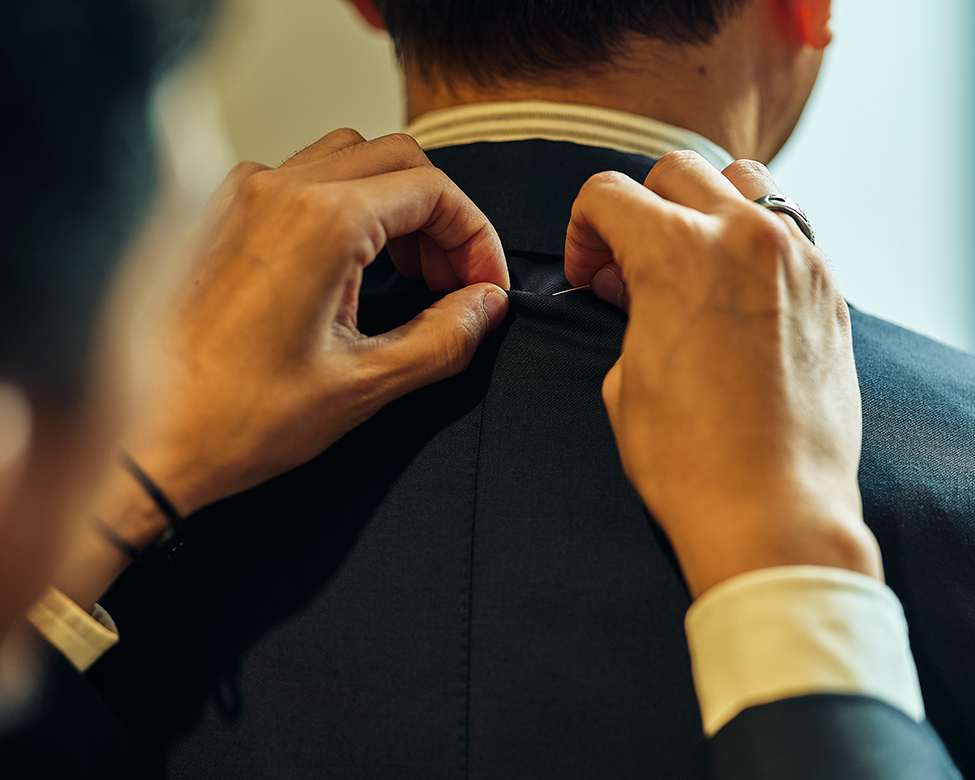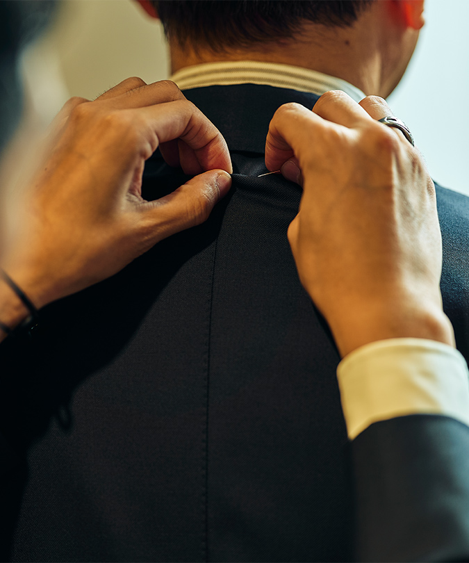 サイズサンプルをご着用いただきながら、体型に合わせて細やかにサイズを調整いたします。見栄えを大きく左右する袖丈や着丈、着心地を左右する肩幅やチェストサイズの調整はもちろんのこと、「肩の傾斜」や「骨格の特徴」などを見抜き、お身体のクセに寄り添った立体的な体型補正によってフィット感を高め、既製品では体感できない着心地を実現します。
